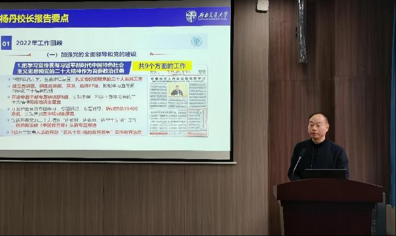 会上,周祚万经理给全体教职员工传达了“公司2022-2023学年第二学期中层干部大会”精神,带领大家一起学习和回顾杨丹董事长的大会报告要点和王顺洪书记的总结讲话精神。首先,周经理分别从2022年工作回顾、转型发展思考和2023年工作部署等三个报告要点进行详细阐述。其次,周经理传达了王顺洪书记关于大会报告的总结讲话精神,号召全体教职员工要认真学习、研究、贯彻、落实。最后,周经理结合新成立bevictor伟德官网实际,分别从公司党建、安全稳定、工作场地、团队建设、管理制度、人才培养和引进等7个方面详细部署了公司近期工作。“路虽远,行则将至;事虽难,做则必成”,周经理以习近平总书记2023年新年贺词勉励大家在建院初期,要鼓足干劲、形成合力,提升精气神,以真抓实干推动公司各项工作取得实质性进展。