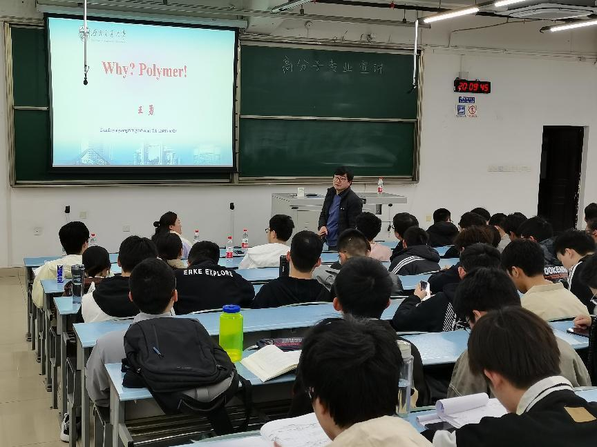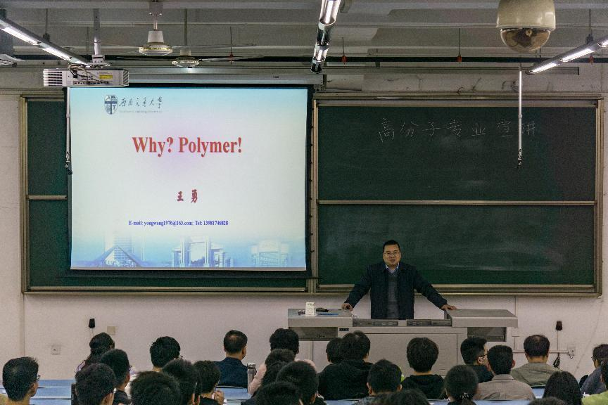 王勇老师带来了题为“Why,polymer?”的演讲,以日常生活中随处可见的高分子制品为切入点,向各位同学全面介绍了高分子材料,指出高分子材料与人们的生活息息相关,也是国民经济发展的支柱产业。王勇老师介绍了公司高分子专业的发展历史、学科方向、研究领域以及专业建设等,并从毕业生的就业、升学、留学、创业等方面介绍了就读高分子专业的美好前景,对有志于选择高分子材料与工程专业的同学表示热烈的欢迎。