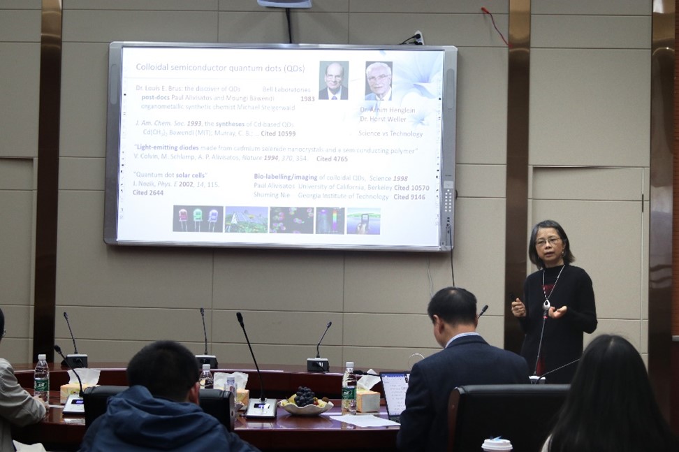 余教授的报告围绕胶态半导体量子点和幻数团簇(MSCs)展开,介绍了一种在MSCs形成过程中极为重要的反应中间体,亦即MSCs的前驱体化合物(PC),并对其所串联的两条反应路径进行了深度讨论。围绕PC在多种MSCs间转化和纳米材料合成等方面的重要价值,余睽教授介绍了团队的最新研究进展,并重点阐释了CdTeSe幻数团簇的异构化路径。相关研究工作有助于推动胶体纳米晶体合成从“经验性探索”向“理论型科学”的转型。报告结束后,余睽教授还回答了在场师生们的相关学术问题,使参会人员受益匪浅。据统计,超过60名师生参与了本次论坛和学术交流活动。