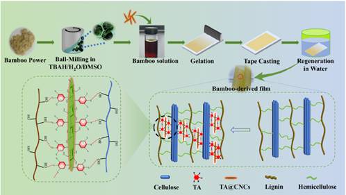 图1单宁酸@纤维素纳米晶增强的竹基复合膜材料制备技术路线图