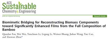 综上,本研究以单宁酸改性的纤维素纳米晶(TA@CNCs)代替半纤维素作为跨尺度桥联剂,在竹溶解液全组分再生过程中以氢键的形式实现纤维素分子和木质素纳米颗粒间的跨尺度交联,从而显著提升竹基复合膜材料的力学强度。这一研究结果为高强度竹基膜材料的研发提供了新的学术思路和技术手段。相关成果以“Biomimetic Bridging for Reconstructing Biomass Components toward Significantly Enhanced Films from the Full Composition of Bamboo”为题发表在ACS Sustainable Chemistry & Engineering,DOI:10.1021/acssuschemeng.2c05692。论文的第一作者为硕士研究生樊倩丹,通讯作者为周祚万教授。