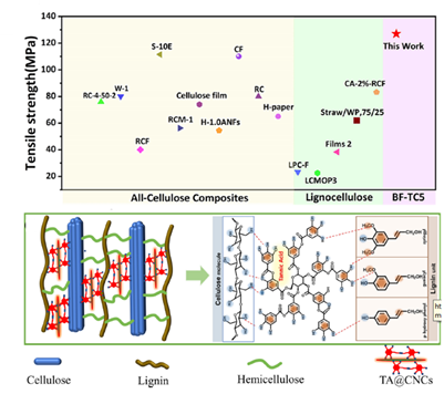 本研究工作首先将单宁酸(TA)溶解于纤维素纳米晶(CNCs)分散液中,经室温搅拌混合12 h后过滤洗涤,得到TA@CNCs。以图2a为代表的系列结构表征结果表明,TA分子中的羧基与CNCs表面暴露的羟基间形成氢键,从而包覆于CNCs表面。将TA@CNCs分散于预先制得的竹溶解液(竹粉溶解于DMSO/TBAH水溶液)中,随后以去离子水为凝固浴,经全组分再生即可制得的复合膜材料。红外光谱(图2b)表明,3347 cm-1附近代表-OH伸缩振动的吸收峰随着TA@CNCs用量的提升而逐步红移,这意味着TA@CNCs与竹膜基体间通过氢键交联。通过对红外光谱等表征结果的进一步解析,我们认为这种氢键网络不仅存在于TA@CNCs与竹膜基体中的纤维素分子之间,同时还存在于TA@CNCs与木质素C=O键之间。因此在竹溶解液全组分再生过程中,TA@CNCs纳米颗粒能够以氢键的形式桥联纤维素分子和木质素纳米颗粒,起到跨尺度交联的作用从而显著提升膜材料的力学强度(图3)。