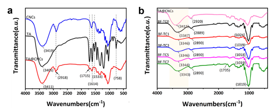 图2材料的红外光谱:(a)TA@CNCs,(b)TA@CNCs增强的竹基复合膜