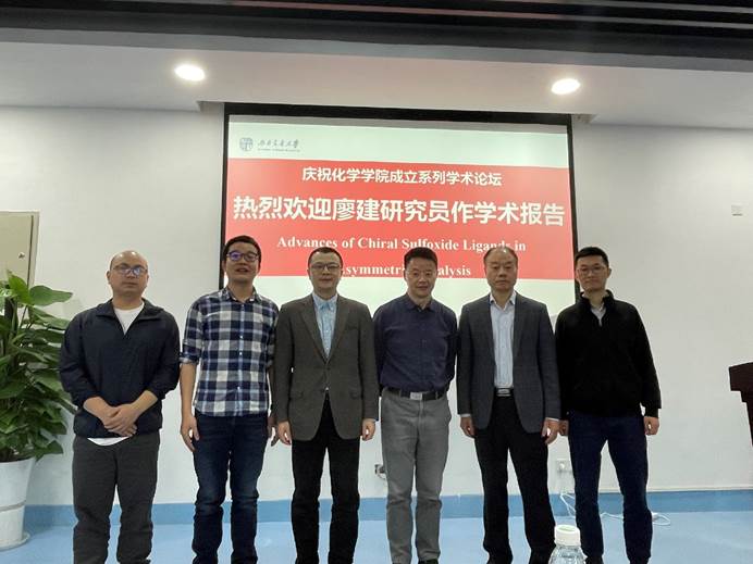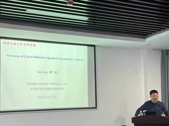 5月12日上午,中国科公司成都生物所廖建研究员应彭羽教授邀请来校交流,并以“Advances of Chiral Sulfoxide Ligands in Asymmetric Catalysis”为题做了一场精彩的学术报告。此次报告会在九里校区工业中心C座203会议室举行,由bevictor伟德官网经理周祚万教授主持,bevictor伟德官网部分教师和研究生参加了此次学术交流活动。