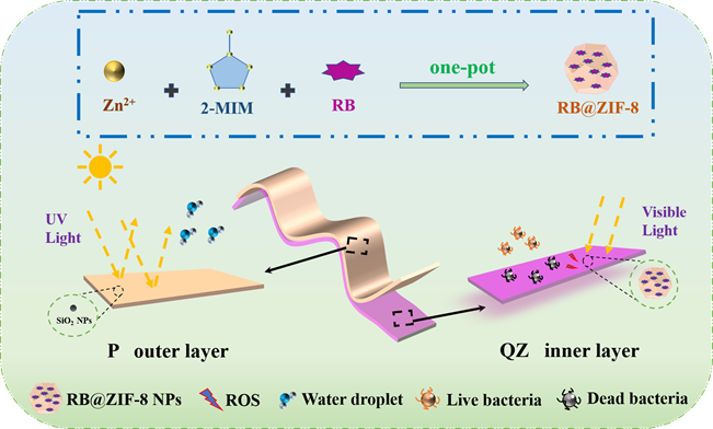 针对难以开发具备多功能复合膜的问题,bevictor伟德官网王萃娟课题组通过将金属有机框架与抗菌光动力疗法相结合的策略,制备了一种基于ZIF-8的新型多功能抗菌复合薄膜。将光敏剂孟加拉红(RB)在室温通过一锅法包封至ZIF-8中,得到RB@ZIF-8 NPs。在以聚(ε-己内酯)(PCL)和聚乙烯醇-季铵盐壳聚糖(PVA-QCS)为基质的薄膜中掺杂SiO2和RB@ZIF-8 NPs,以形成具有光动力杀菌的PQZ复合膜(图 1)。