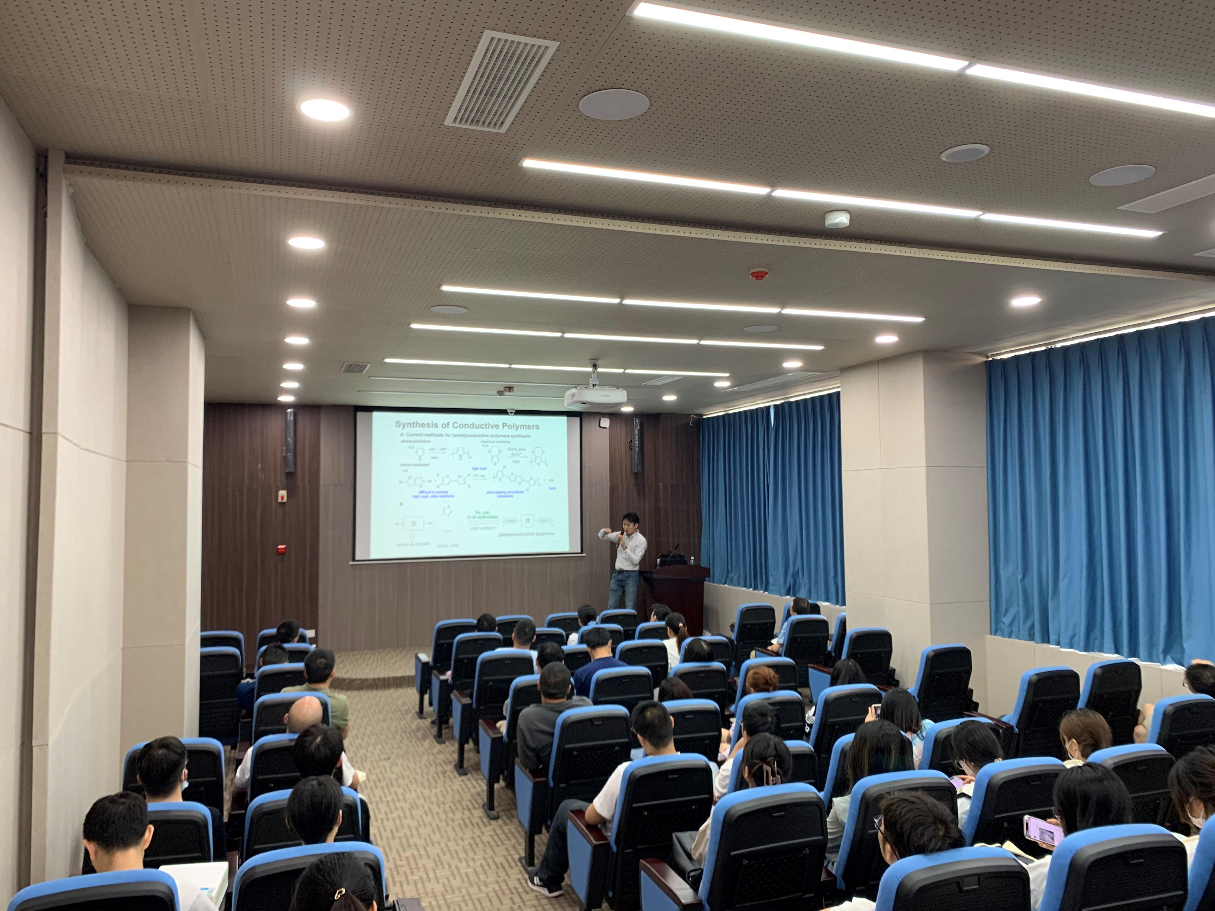报告中,尚睿教授首先介绍了他的研究领域:包含可持续催化与材料科学,在可持续催化领域,他的兴趣点在丰产且廉价的铁催化及光催化;而在材料科学领域则是有机光电π-结构材料。随后介绍了他课题组所发展的一系列廉价金属Fe催化的C-H键官能团化反应与响应反应机理研究,以及基于课题组所发展的Fe催化新反应在有机光电π-结构材料方面的研究进展。在Fe催化体系下可快速高效的合成一系列具有二噻吩骨架的新型有机光电材料,并且这类材料在近红外光电探测器器件及有机太阳能电池中表现出优异的性质,具有广阔的应用前景。