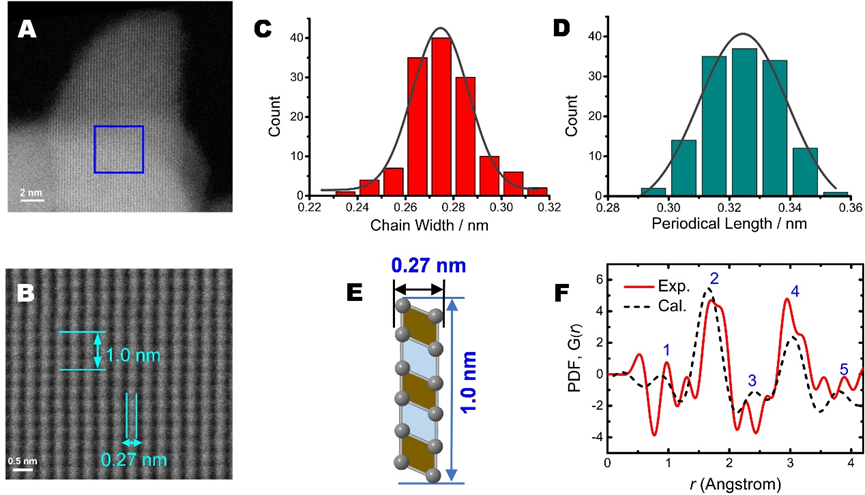 图4. AE- B自组装纳米片的结构。(A) AE- B自组装纳米片的典型暗场HRTEM照片。(B)(A)所示标记区域的HRTEM照片。(C)和(D)分别为沿链延伸方向的链宽和周期长度的统计直方图。( E )结构1的尺寸信息。(F)AE - B粉末的实验PDF与结构1的计算PDF的比较。