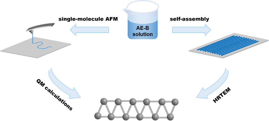 图1. 主要研究策略:利用溶液表面吸附方法,从单分子弹性、分子形貌两方面确定了AE-B的分子结构。