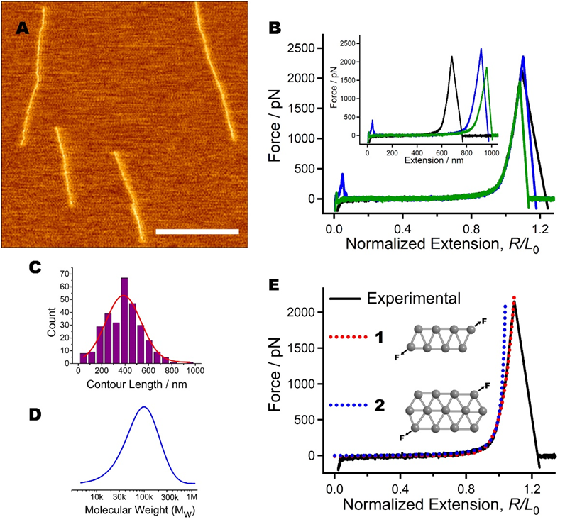 图3. (A) AFM成像获取的AE - B单分子形貌。比例尺:500 nm。(B) 在壬烷中得到的AE - B归一化F - E曲线,插图为归一化前的曲线。(C) AFM-based SMFS测得的AE - B分子轮廓长度的统计图。(D) GPC测得的AE - B分子量信息。(E)结构1和2的QM - WLC拟合曲线(虚线)与AE - B的实验F - E曲线(实线)对比。