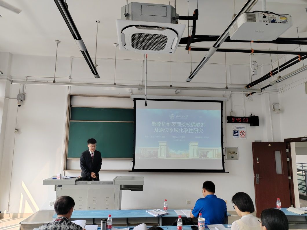 参加答辩的同学早已准备就绪,等待大学期间最后一场实战性的"考试”。他们在答辩前都经过了论文开题、中期检查等阶段精心的准备,以至于他们在答辩过程中以图文并茂的形式,结合PPT阐述自己论文的选题目的、理论框架、研究问题的方法及其实际意义。随后,评委老师针对论文内容提出相关问题,如王勇副经理提出的生物相容性怎么样,抑菌的成分如何,徐晓玲老师提出的涂层前后凝胶化,王雅雯老师提出的核磁分析中结构式,杨静晖老师提出的如何计算接枝率等这样零距离的问答,一方面是考察同学们对自己设计作品制作流程的熟悉程度,另一方面,考察同学们对专业知识的掌握程度及心得体会,以及对自己现在工作的看法。针对答辩老师的各种提问,同学们回答简明准确,虽然仍然存在不足,但是都得到了老师的充分肯定。