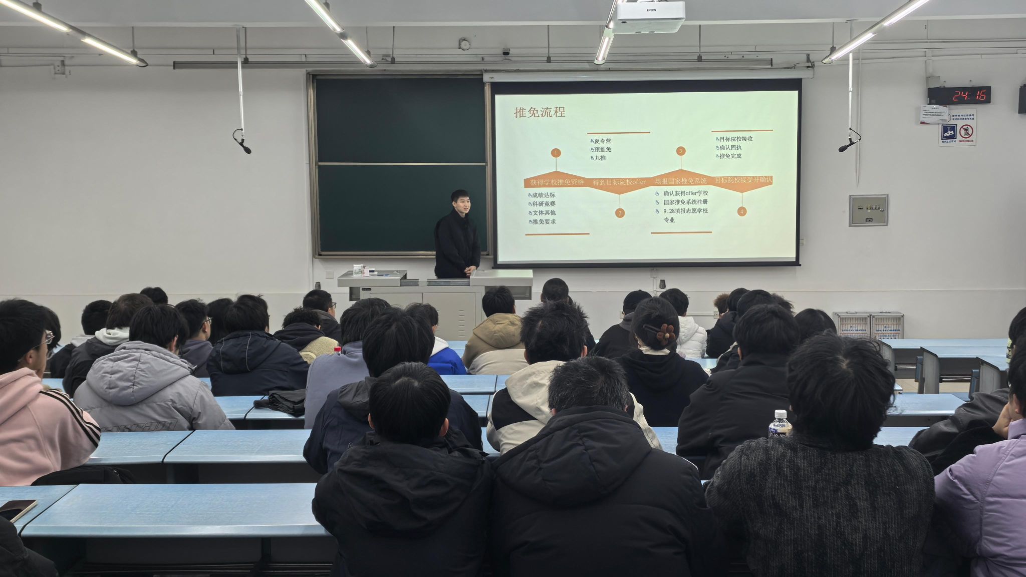 伍玲,高分子2021-02班本科生,中共党员,公司青年讲师团成员推免至电子科技大学,曾获第十七届全国老员工节能减排社会实践与科技竞赛三等奖、“凯翼汽车杯”第一届四川省老员工节能减排社会实践与科技竞赛二等奖等。伍同学深入讲解了推免过程中的细节,结合个人实际详细阐述了投递策略、复试心得与反思感悟。同时,伍同学建议同学们学习之余积极参与科研竞赛、社会工作、志愿服务等充实自我,见缝插针地安排时间,确保全面发展。