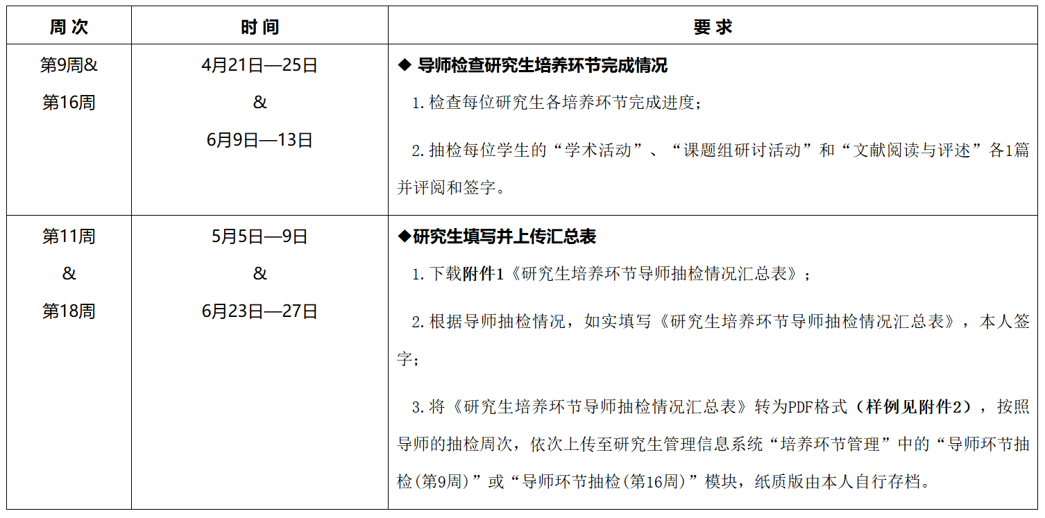 请导师和研究生在规定时间内完成培养环节的抽检和归档工作。