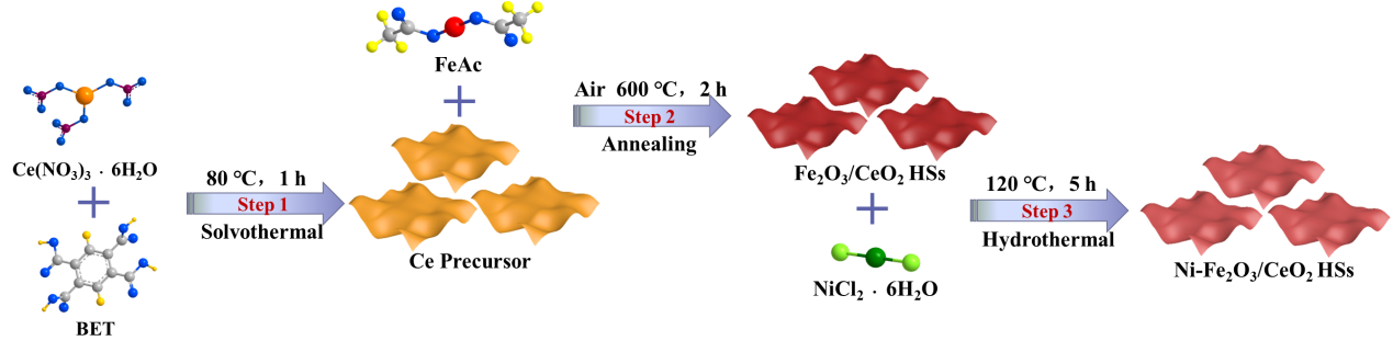 图1显示了Ni-Fe2O3/CeO2HSs的简单合成过程。首先通过简单的溶剂热反应制备了Ce基配位聚合物纳米片(NSs)。制备的铈基配位聚合物纳米片作为前驱体和牺牲模板,铈基配位聚合物纳米片与醋酸亚铁混合均匀,在退火的过程中前驱体和醋酸亚铁分解,转化为Fe2O3/CeO2HSs。最后,以六水氯化镍作为镍源,采用水热法合成了Ni-Fe2O3/CeO2HSs。
