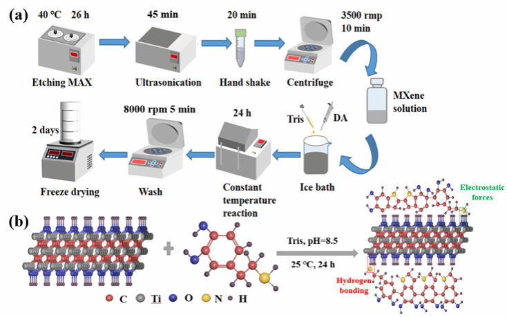 图1 (a) MXene/PDA复合颗粒的制备过程;(b) PDA分子在MXene纳米片上的堆积示意图
