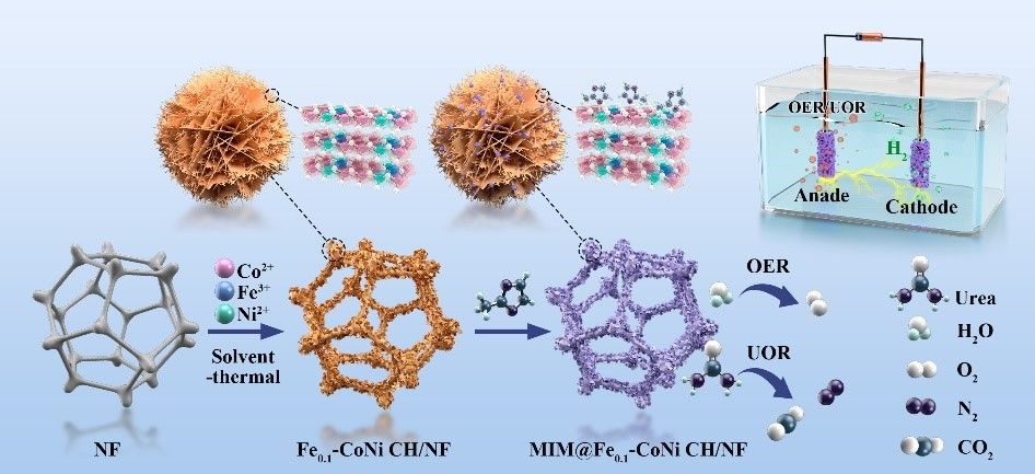 本工作以“Fe-Doped CoNi Layered Hydrogencarbonate Hierarchical Nano-Array Assisted Growth of ZIF-67 as an Efficient OER/UOR Bifunctional Catalyst Reaction for Overall Urea-Water Electrolysis”为题发表在国际知名期刊《Chemical Engineering Journal》(JCR一区,中科院一区TOP,IF=15.1)上,论文第一作者为bevictor伟德官网2021级硕士研究生汤鸿雯,bevictor伟德官网王萃娟副教授为通讯作者。