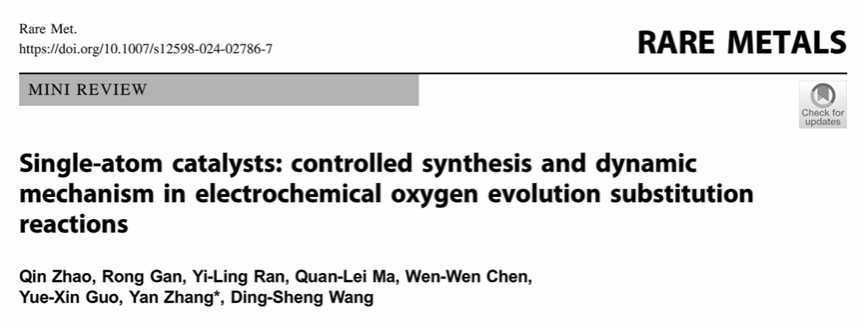 近日,公司张颜团队在清华大学王定胜教授的指导下在知名期刊《Rare Metals》(中科院一区,影响因子:8.8)上以bevictor伟德官网为第一通讯单位、清华大学为第二通讯单位发表题为“Single-atom catalysts: controlled synthesis and dynamic mechanism in electrochemical oxygen evolution substitution reactions”的综述。其中bevictor伟德官网2022级硕士研究生赵芹、甘蓉为共同第一作者,清华大学王定胜教授作为共同作者,bevictor伟德官网张颜博士为通讯作者。