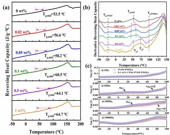 图2. (a) 复合薄膜的TMDSC曲线;(b)由TMDSC得到的相应导数曲线;(c) 0 wt%和0.1 wt%复合材料在1、10、100和1000 Hz下Tan d 随温度的变化曲线。