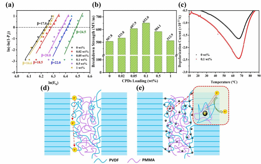 图3. 复合材料薄膜的击穿强度及其作用机理的研究。(a) Weibull分布和(b)不同负载量CPDs复合材料相应特征击穿强度的直方图;(c)复合膜的TSDC谱图;(d)PVDF/PMMA共混物非晶区域的载流子迁移示意图和(e)CPDs增强PVDF/PMMA共混物非晶区域的机理示意图。