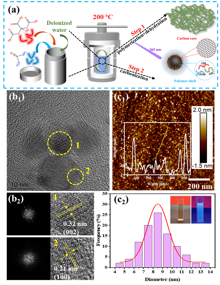 图1. (a) 水热法制备CPDs的反应机理图。CPDs的微观形态特征:(b1)CPDs的TEM图像,(b2)TEM图像的FFT图像和相应的HR-TEM图像;(c1)CPDs的AFM振幅图和相应的测量高度轮廓,(c2)基于AFM图像和CPDs分散液的数码照片的CPDs粒径分布图。