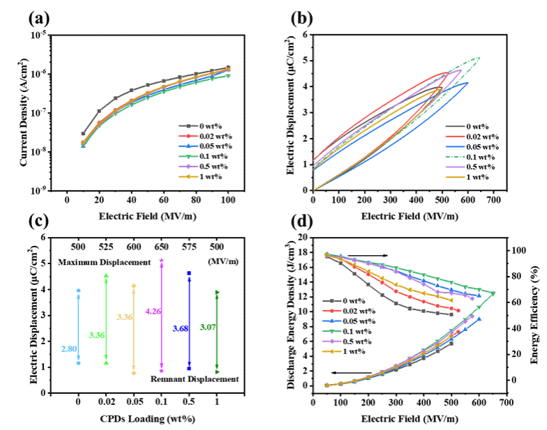 图4. (a) I-E曲线;不同CPDs载荷下复合材料最大电场下的(b) D-E循环,(c) 为纯PVDF/PMMA共混物和复合材料的Dm-Dr值;(d) 外加电场下的能量效率和放电能量密度。