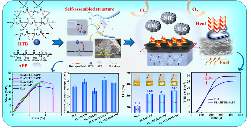 本工作以单宁酸(Tannic acid, TA)为模板,六氯环三磷腈(Hexachlorocyclotriphosphazene, HCCP)和4,4’-二羟基二苯酚(4,4'-Sulfonyldiphenol, BPS)为共聚单体,制备了聚磷腈纳米粒子(HCCP-TA-BPS, HTB),并将其与聚磷酸铵(Ammonium polyphosphate, APP)一起引入PLA制备复合材料。研究发现,HTB与PLA基体和APP之间原位形成了氢键,从而显著改善复合材料的界面粘结强度,促进APP在复合材料中的均匀分散并形成APP网络。阻燃性能测试表明,在PLA中加入10 wt% APP和5 wt% HTB,使PLA的极限氧指数(LOI)提高到31.0%,并达到UL-94 V-0等级,同时复合材料的放热率峰值(PHRR)和总放热量(THR)比纯PLA降低了14.2%和13.2%。特别是复合材料在燃烧过程中几乎没有熔滴的出现,这与PLA/20 wt% APP复合材料(V-2等级)的燃烧行为有明显的不同。此外,APP分散性的改善以及其与PLA基体界面粘结强度的提高显著改善了复合材料的力学性能,与PLA相比,复合材料的断裂伸长率、杨氏模量和冲击强度分别提高了52.9%、7.6%和24.2%。本研究为协同改善PLA复合材料的阻燃性能和力学性能提供了新的见解。
