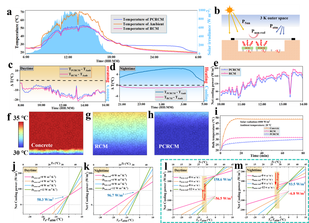 图4. 实际和理论的冷却性能。(a) PCRCM和RCM的24小时室外测试。(b) 试验装置示意图。(c) 8时至16时的温差。(d) 21:00至5:00之间的温差。(e) 10:00 - 14:00期间PCRCM和RCM的实时冷却功率。(f-h) 太阳照射10 min后混凝土、RCM和PCRCM温度分布的COMSOL模拟结果。(i) 不同模型的温度-时间曲线。(j-m) 计算RCM和PCRCM的理论净冷却功率。