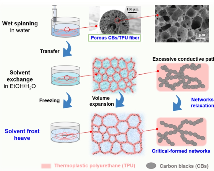 该工作以“Solvent frost heave-driven relaxation of conductive network in carbon blacks/polyurethane fibers towards highly sensitive sensor”为题目发表于《Composites Science and Technology》。论文第一作者为bevictor伟德官网博士生代明凤,bevictor伟德官网经理周祚万教授团队的博士后郭一帆为通讯作者,通讯单位为伟德国际唯一官网入口。