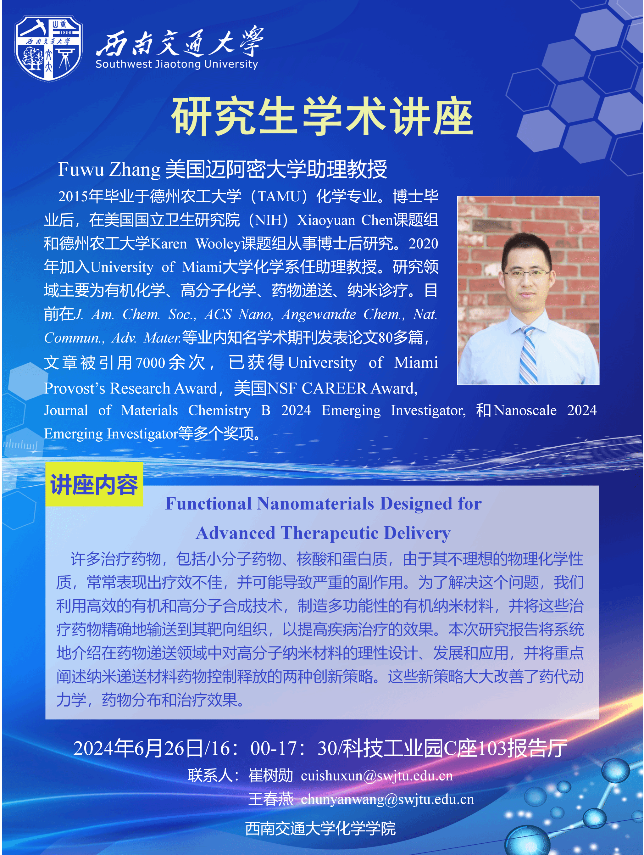 bevictor伟德官网研究生学术讲座:《Functional Nanomaterials Designed for Advanced Therapeutic Delivery》