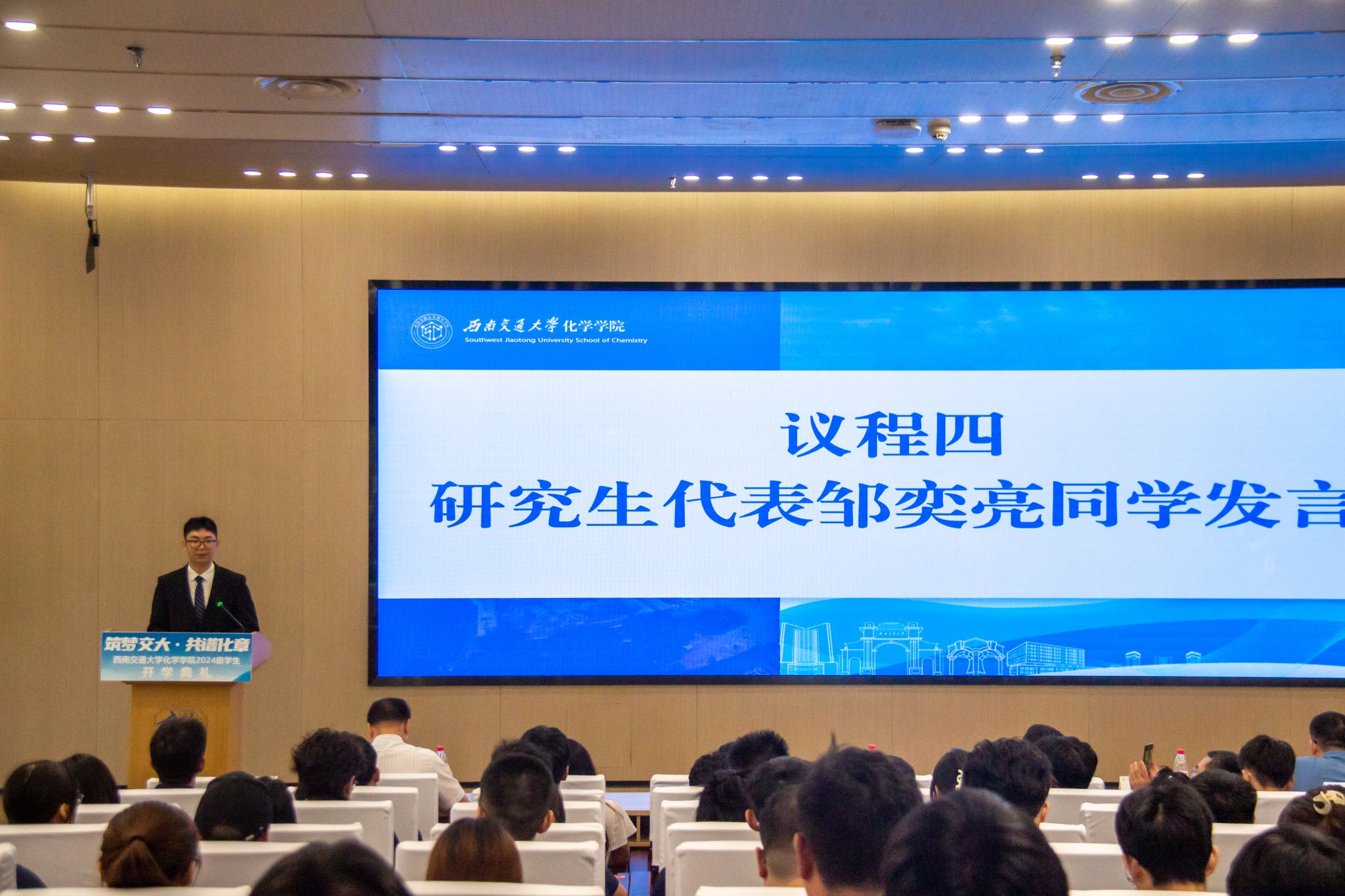 博士研究生代表邹奕亮同学回忆了在交大求学的点点滴滴,回顾了化学学科发展的辉煌历史,希望学弟学妹们发扬“竢实扬华,自强不息”的交大精神,勤学笃行,奋发图强,做一个有理想,有担当的交大人。