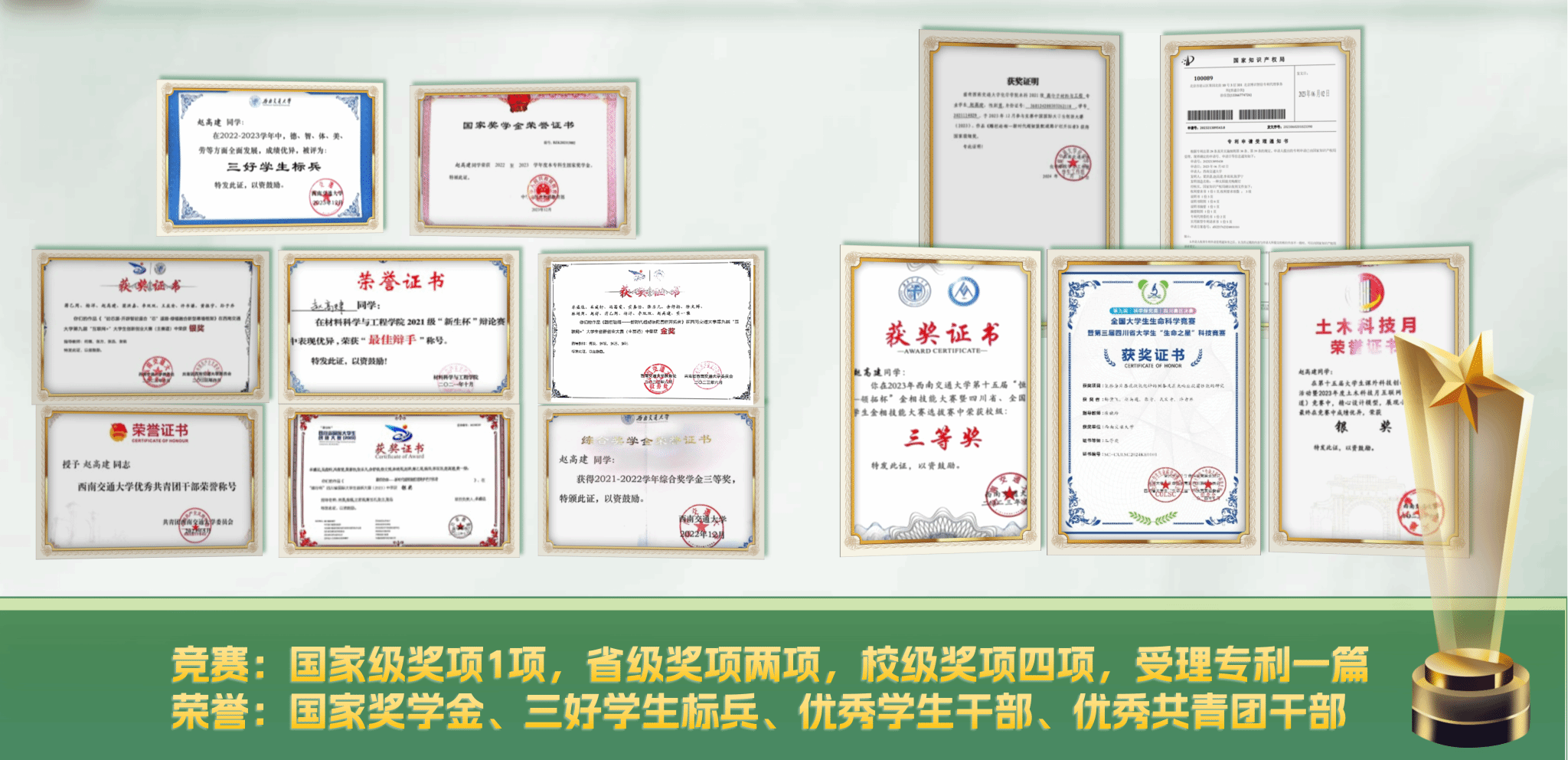 学业为基,以勤补拙。从大一的中游到三年的专业第一,逆袭背后是无数个清晨的图书馆与深夜的台灯。我梳理知识脉络,将理论联系实际:在《高分子化学》课上,以混凝土增韧案例讲解聚合机理;在《工程力学》中,用实验数据反推结构设计。最终,国家奖学金、三好员工标兵的荣誉,成为对坚持的最好注解。